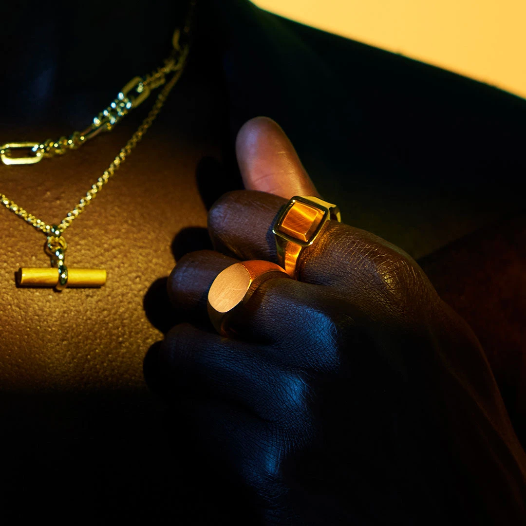 The Brushed Round Ring is a classic signet shape, made from solid Sterling Silver for a heavy weight and high quality. The ring has a brushed finish on the outer surfaces, while the inside and edges of the ring are polished, giving a unique texture change to the ring and a premium finish. The ring is plated in 18ct Gold Vermeil plating which is 2.5 microns thick, giving it a rich and warm gold colour and a reliable plating.Β