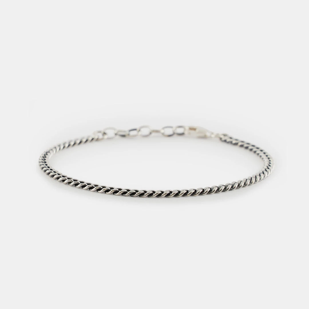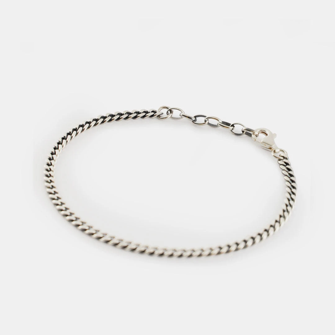 The classic curbΒ chain is an essential jewellery piece and styles differ. This version is made up of 3mm diamond cut links, which means they have a flat surface giving a reflective finish and a precise shape. The bracelet is 17cm long with a 3cm adjustor chain, so will fit up to 20cm, andΒ is finished with a Sterling Silver lobster clasp.