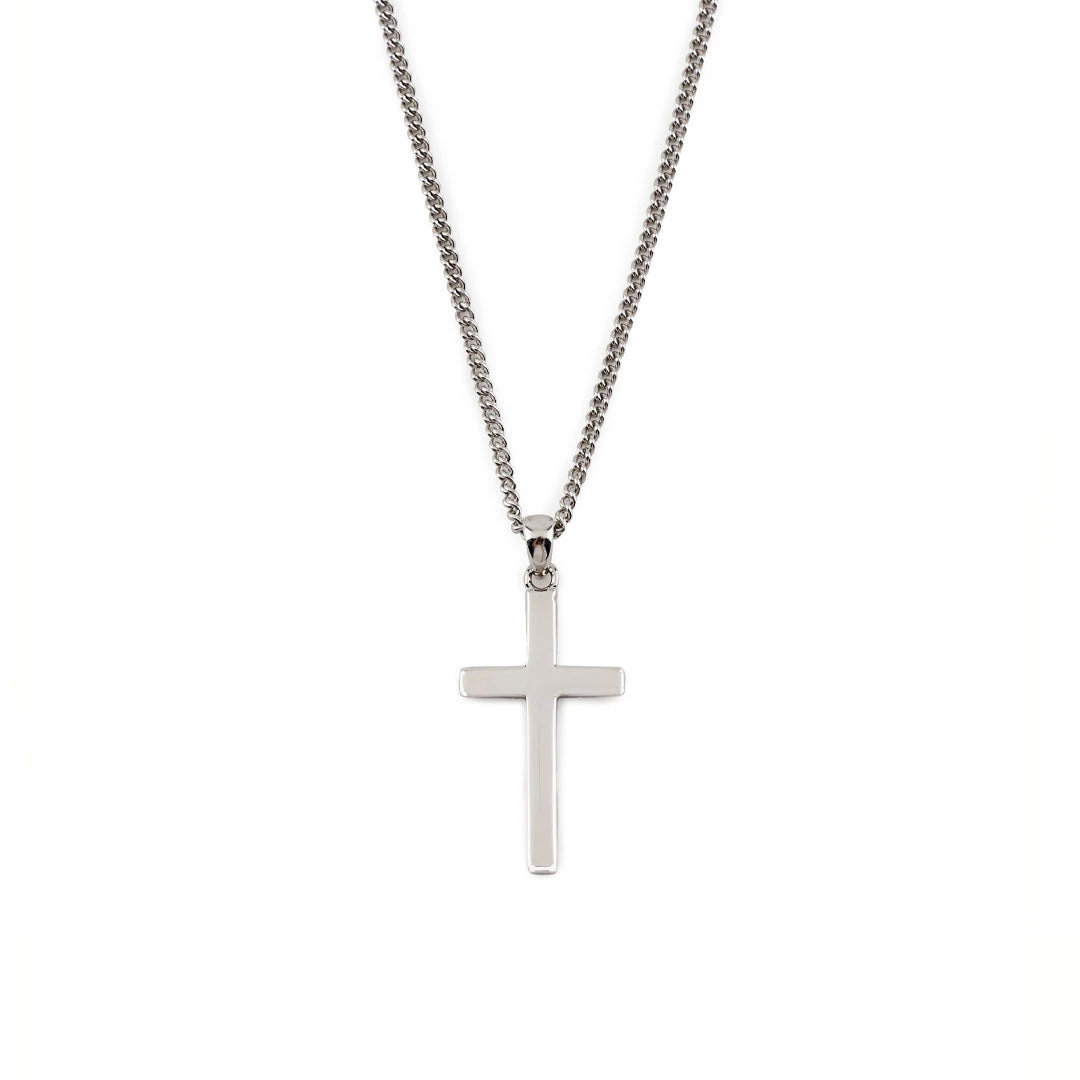 AnΒ iconic Cross symbol pendant hangs on a slim 2mm curb chain, which can be adjusted from 46 – 52cm and fastens with a Sterling Silver lobster clasp. The necklace is finished with a rhodium plating, meaning that it has a polished, high shine look and will slow down the oxidisation process.
