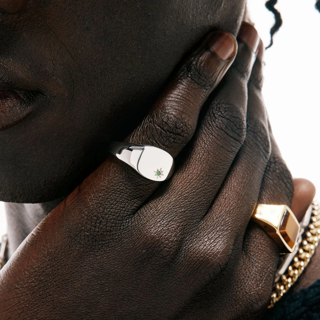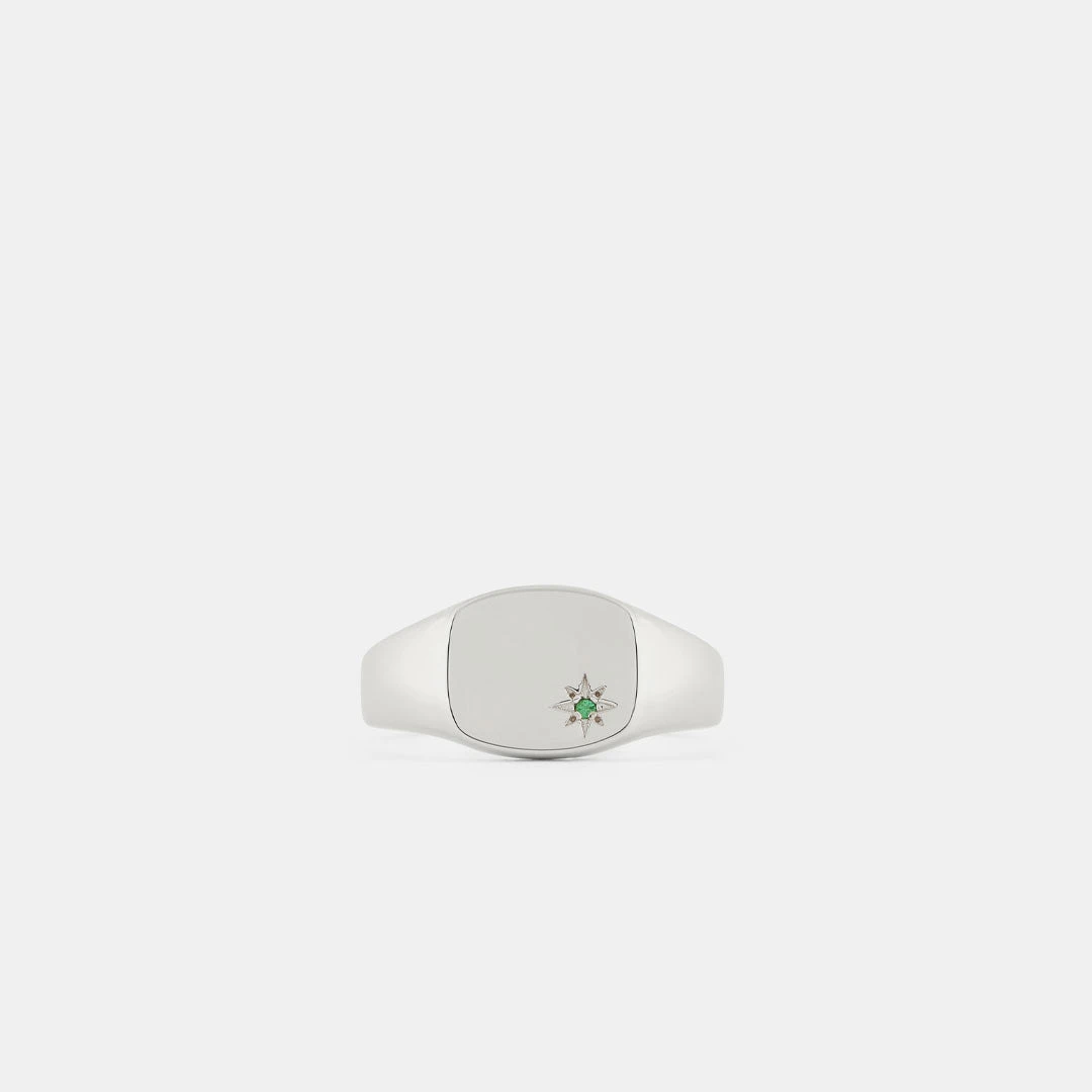 The ring has a soft square face which curves into shapely shoulders that wrap around the finger into a thick band making it a strong and sturdy every day ring. The bottom corner of theΒ ring face has an engraved star setting which holds a natural, rich greenΒ EmeraldΒ gemstone. EmeraldΒ is the birthstone forΒ May birthdays and is traditionally given as a gift for 20th Wedding Anniversaries.