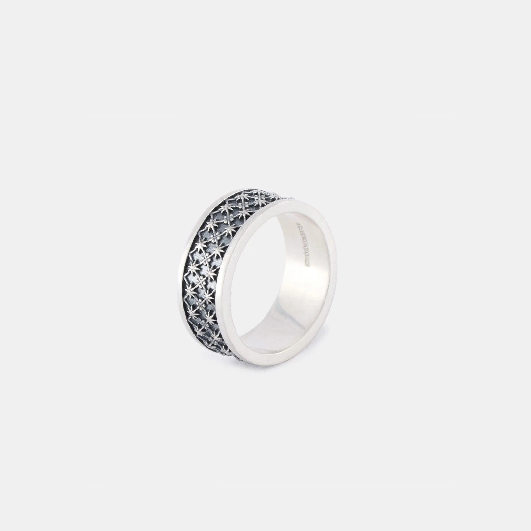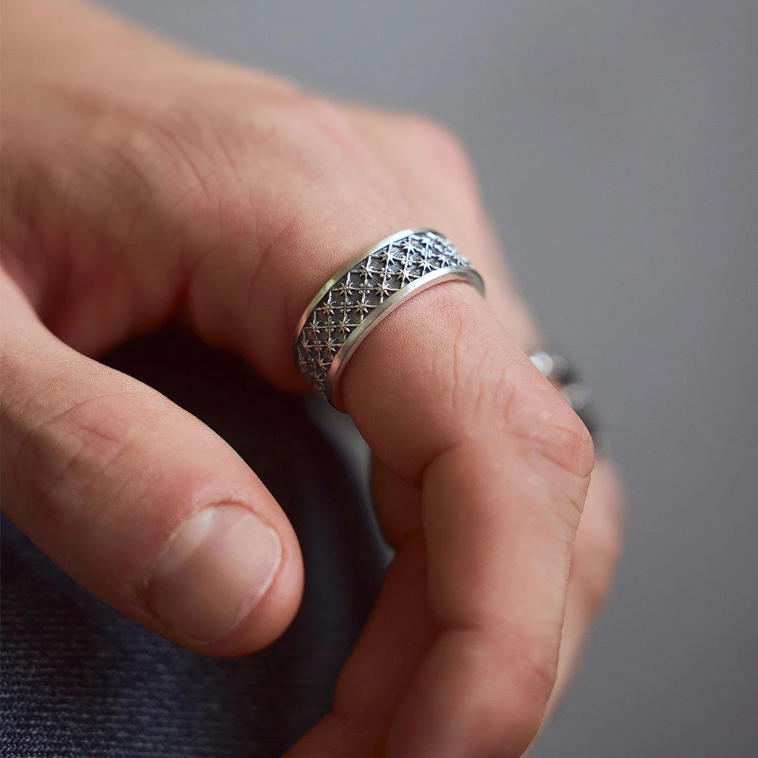 The Silver Jacquard Ring is a thick band ring with intricate detailing and a smooth inside for comfort. The ring is made fromΒ 925Β Sterling Silver and is hallmarked by theΒ Goldsmiths’ Company Assay OfficeΒ verifying its quality.