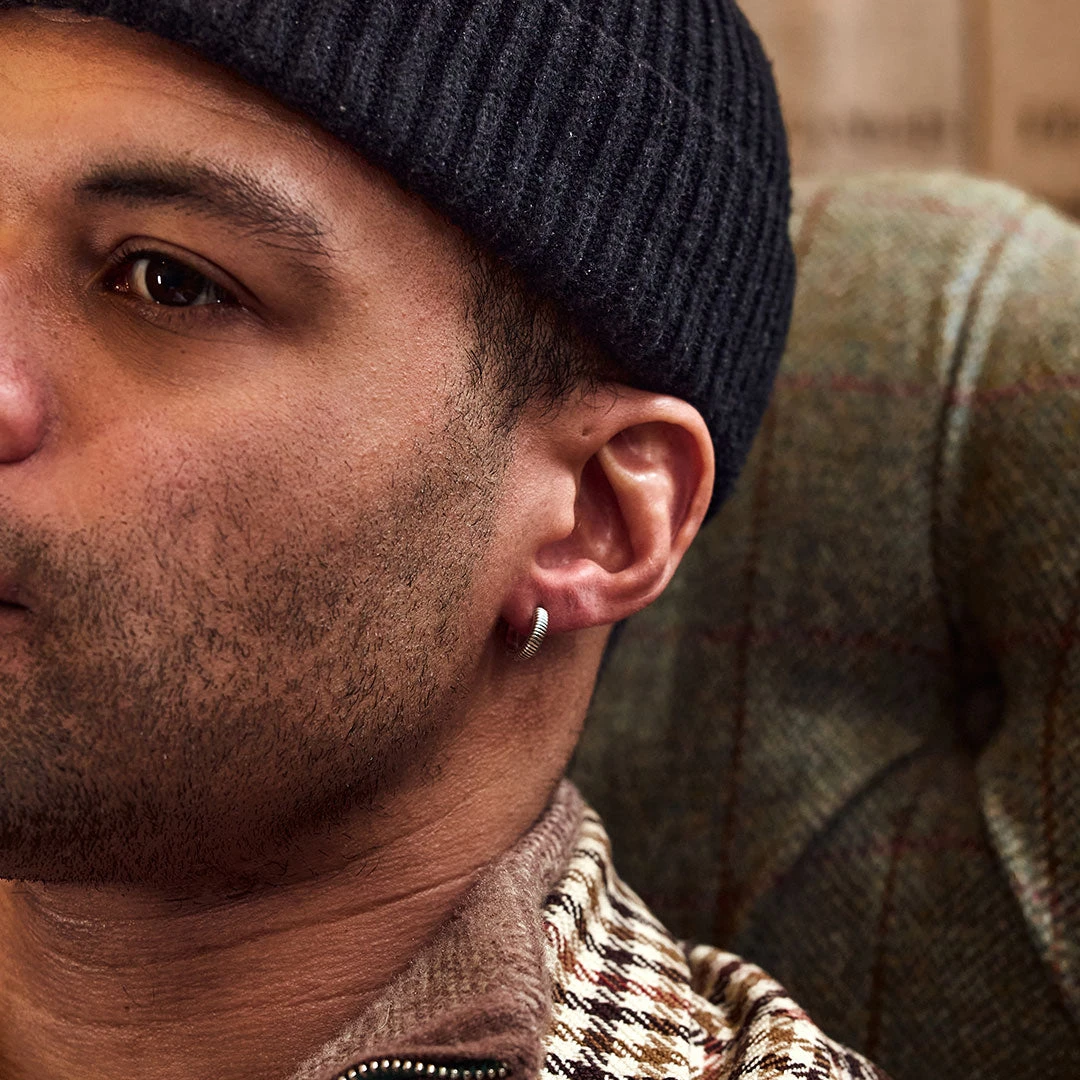The Silver Lasso Earring is a huggie earring with a ridge texture design. The earring is made from 925 Sterling Silver, the same material as our hallmarked pieces.
