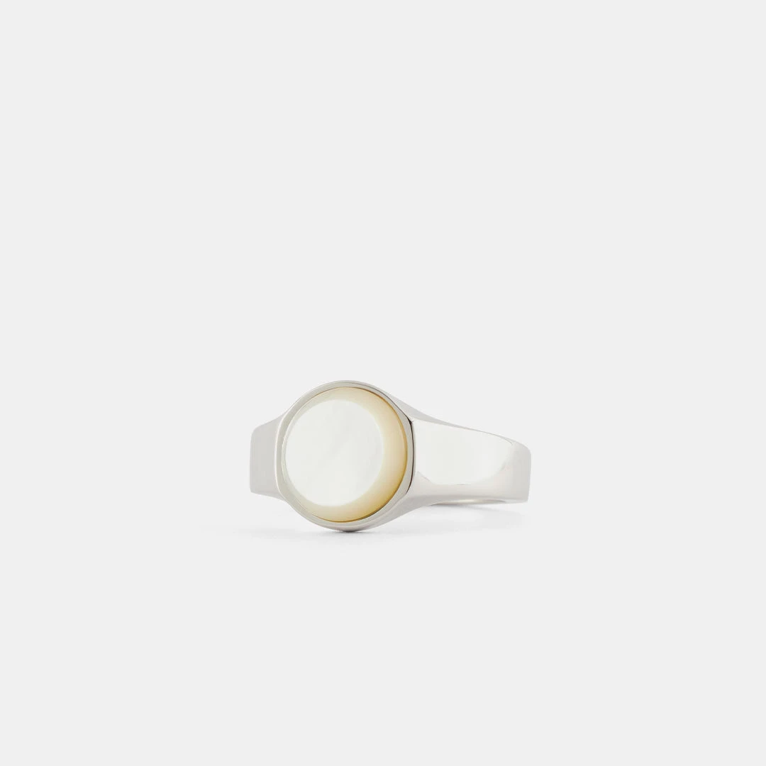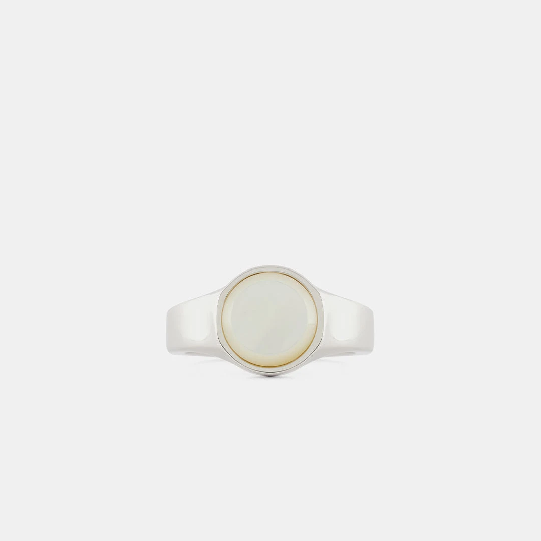 TheΒ Mother of Pearl Ring is a classic signet ring design with aΒ circularΒ face. The centre of the design is the ethereal, naturalΒ Mother of Pearl stone, with bevelled edges. Mother of Pearl is a relaxing, soothing and calming natural gemstone, providing gentle healing properties and relieving stress. The ringΒ is finished in a premium Rhodium Silver plating that won’t discolour or age.Β Rhodium plating is a premium Silver coloured plating that gives the jewellery a polished, reflective finish. As it is part of the platinum metal family, it is harder than gold so provides jewellery with a durable surface which resists tarnish.