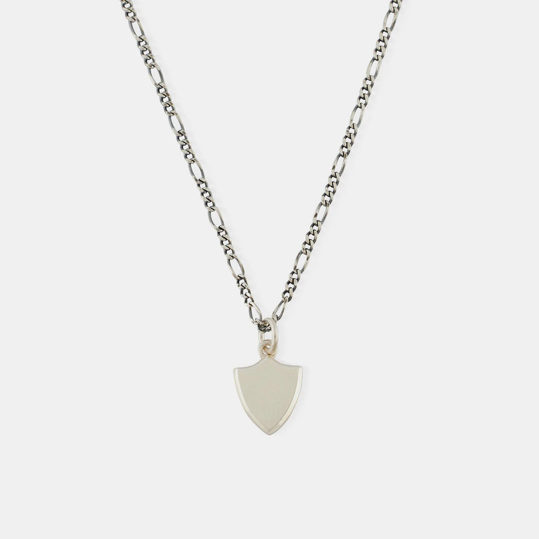 The Silver Shield Necklace features unique shield shaped pendant that hangs from a slim figaro chain that can be adjusted from 48-54cm and fastens with a Sterling Silver lobster clasp. The necklace can easily be worn as an everyday piece either alone or styled with other necklaces, such as the Silver Estoc Necklace for a statement look.