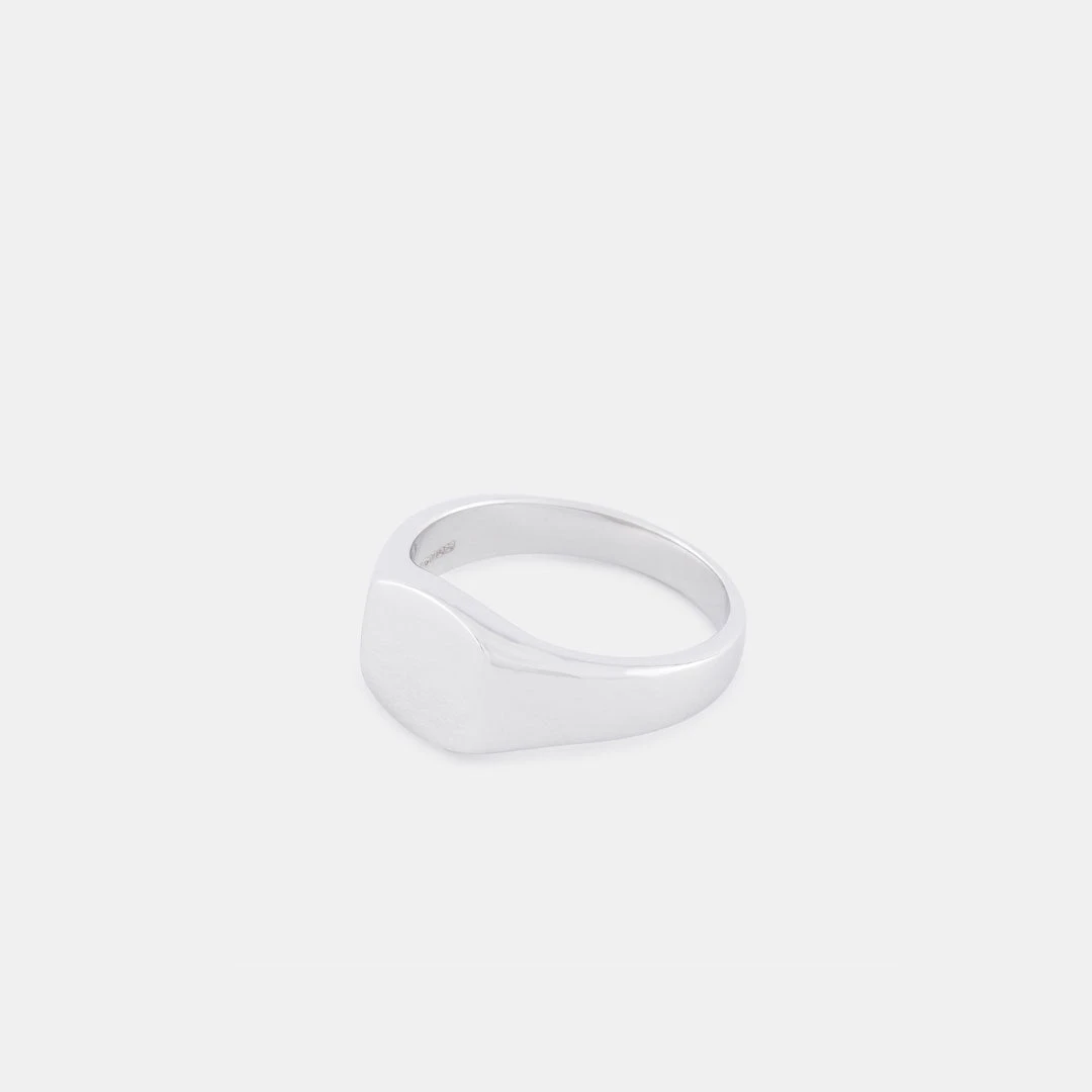 The ring has a soft square face which curves into shapely shoulders that wrap around the finger into a thick band making it a strong and sturdy every day ring. The ring is finished with a Rhodium plating, meaning that it has a new, polished Silver look and won’t oxidise as quickly. It is the perfect ring for someone looking for a timeless piece of jewellery that they can wear again and again.