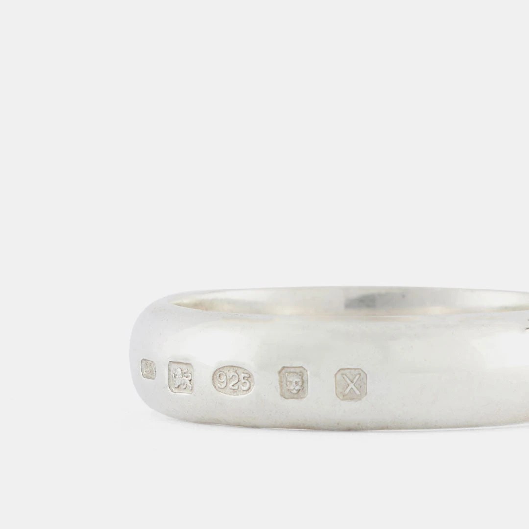 The ring designΒ is 5 struck hallmarks;Β SDN (Serge DeNimes sponsors mark), Lion (Fineness mark), 925 (Silver quality),Β Leopards Head (the mark of Goldsmith’s Company Assay Office) &Β X (Year of marking) – please note the year mark will change annually. V = 2020, W = 2-21, X = 2022,Β Y = 2023, Z = 2024.